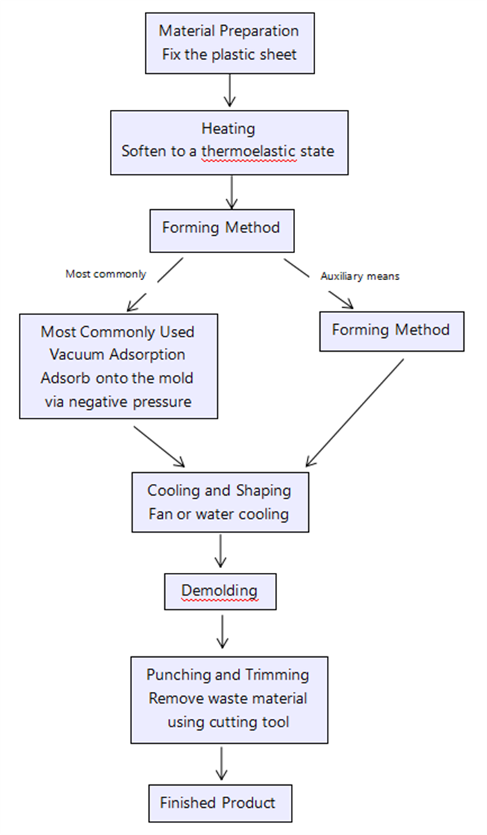 Nguyên tắc cốt lõi: Làm nóng và làm mềm tấm nhựa, sau đó dùng chân không để hấp phụ lên bề mặt khuôn, sau khi nguội sẽ thành hình.