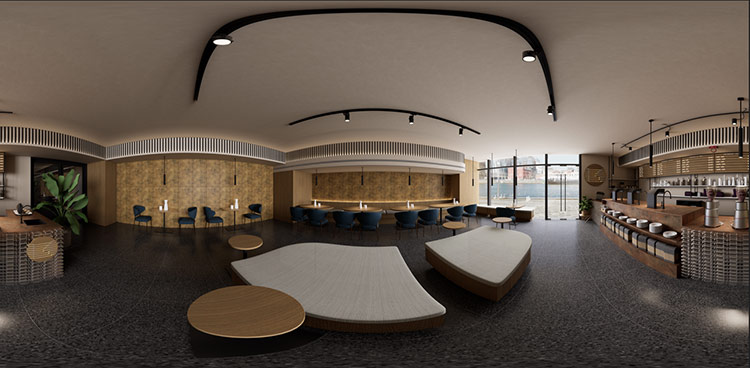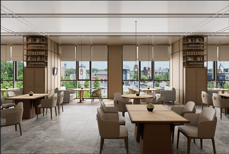 * Màu sắc trung tính ấm áp: Tông màu caramen pha trộn màu nâu đỏ với sự hiện đại, phù hợp để tạo nên một môi trường thương mại hoài cổ.
